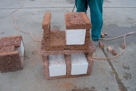 Ďalším krokom je vyrezanie častí tvárnic v rohoch, osteniach a pri napojení vnútorných stien (obr. 4, 5). Zarezaním sa zabezpečí pretečenie betónu a zvýšenie súdržnosti stien.
