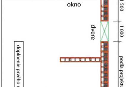 Po zatvrdnutí cementovej malty možno pristúpiť k ukladaniu tvárnic druhého radu (obr. 6). Začína sa od rohu, kde sa osadí rohová tvárnica. Tá sa položí v opačnom smere, ako je uložená tvárnica v prvom rade. Potom sa k nej pridá doplnková rohová tvárnica. Týmto uložením sa zabezpečí väzba muriva. Postupne sa doloží celý druhý rad. Tvárnice v rohoch, pri ostení a pri napojení vnútornej steny treba vyrezať. V nasledujúcich radoch sa ukladajú tvárnice podľa prvých dvoch radov až do výšky steny 1 m.