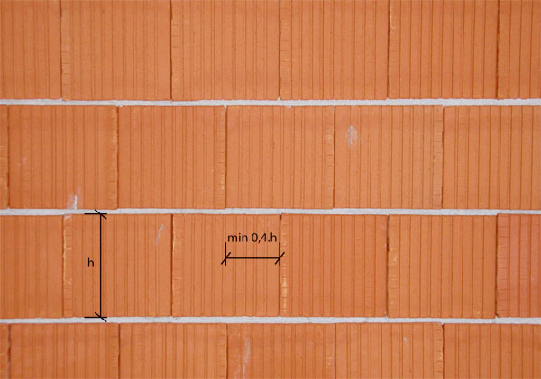 • minimálna väzba, t. j. vzdialenosť styčných škár v susedných radoch tehál, má byť väčšia z hodnôt 40 mm alebo 0,4-násobok výšky murovacieho prvku. Pri tehlách s výškou 238 mm je minimálna dĺžka väzby 95 mm;