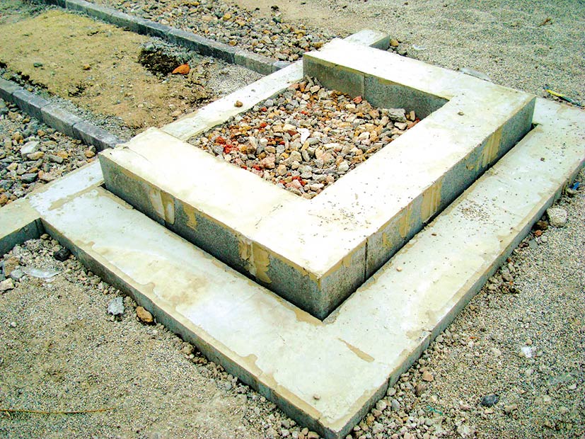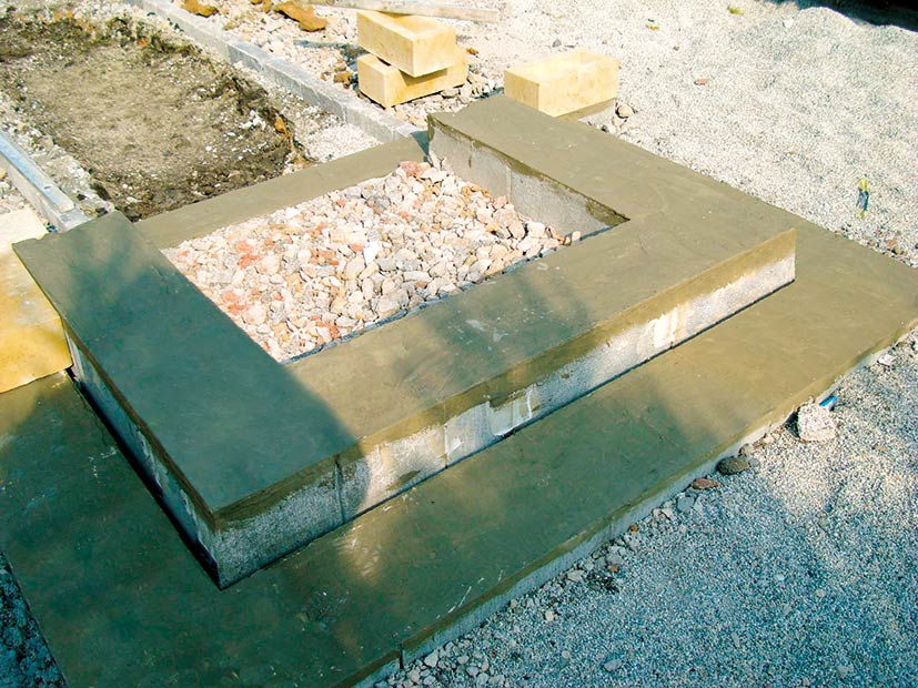 Pred kladením jednotlivých tvárnic je potrebné vytvoriť základovú konštrukciu. Výkop na betonáž základovej konštrukcie by mal siahať do nezámrznej hĺbky (minimálne 800 mm). Na dne výkopu sa vytvorí mrazuvzdorné podložie použitím zhutneného štrkopiesku v hrúbke približne 200 mm. Následne možno vybetónovať základ. Tvar budúceho schodiska sa vymodeluje pomocou debniacich betónových tvárnic. Po vytvrdnutí betónu sa na vytvorenú základovú konštrukciu aplikuje tekutá hydroizolácia podľa odporúčaní výrobcu.