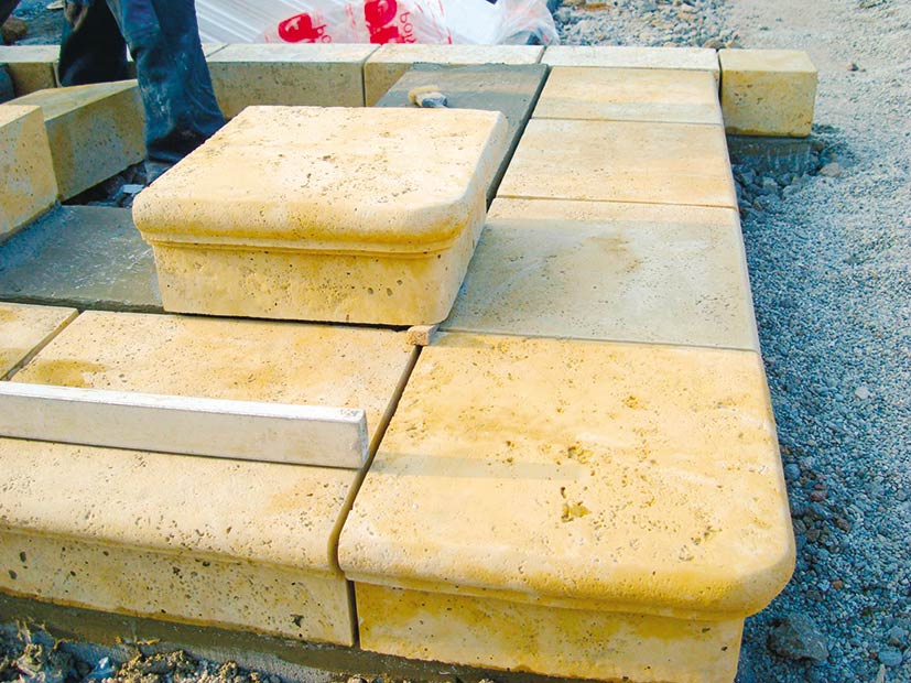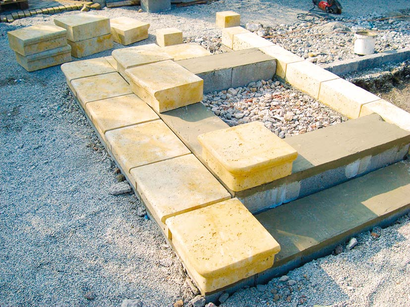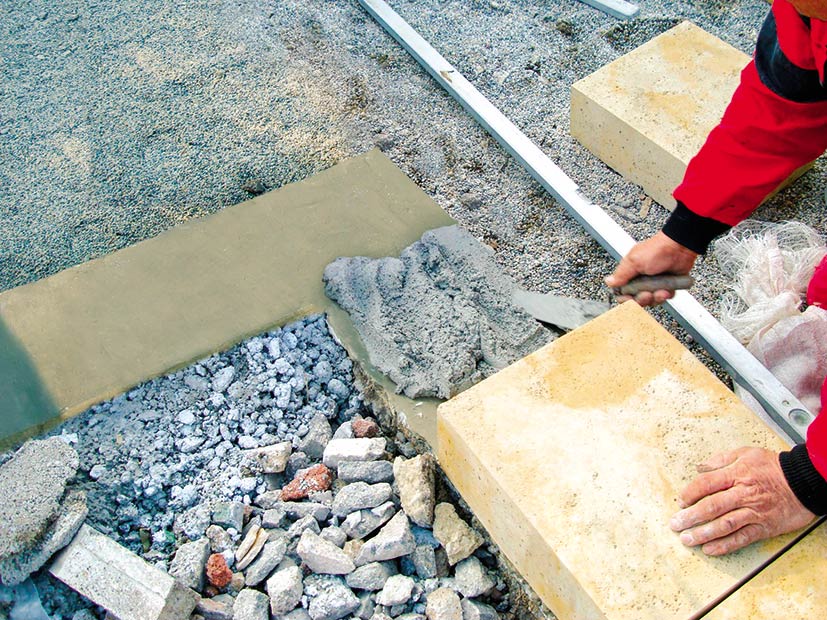 Na základ sa následne nanesie pomocou murárskej lyžice hrubé maltové lôžko. Odporúča sa použiť maltu vhodnú zároveň na murovanie aj škárovanie. Je potrebné dodržiavať hrúbku ložnej a styčnej škáry 5 až 10 mm. Maltou sa vyrovnajú prípadné nerovnosti. Pri osádzaní jednotlivých prvkov sa pomocou vodováhy sleduje rovina.