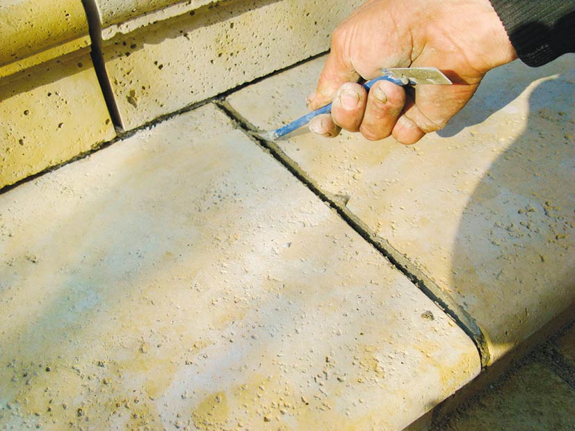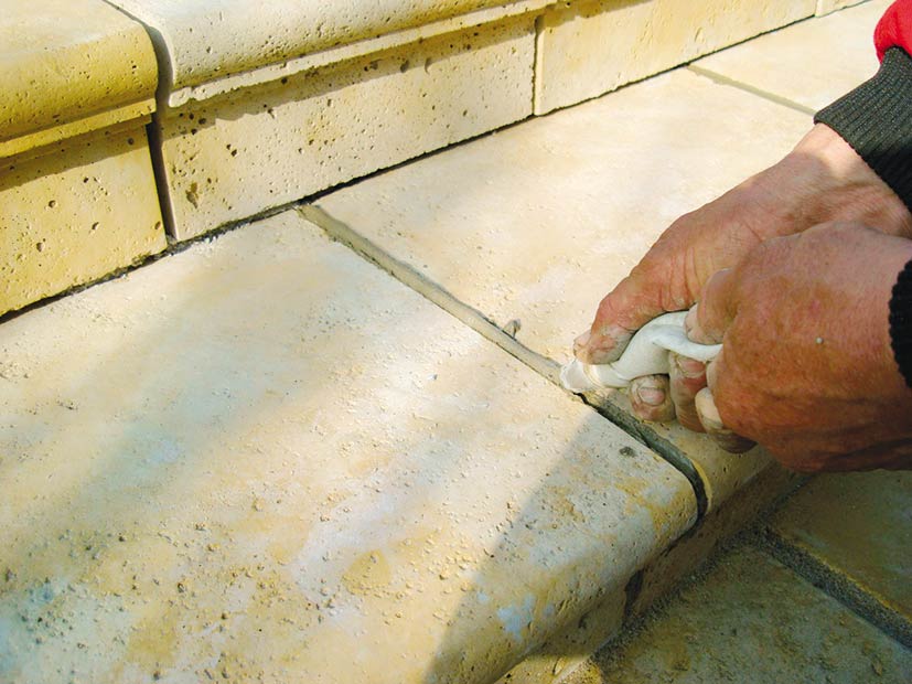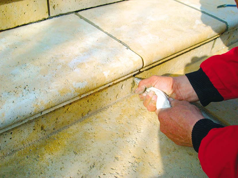 Rovnakým spôsobom sa pokračuje ďalej pri postupnom budovaní schodiska. Pri osádzaní schodov je potrebné dbať na vzájomný presah schodov 10 až 20 mm. Po vytvrdnutí lepiacej malty (približne 24 hodín) možno schodisko vyškárovať. Škárovacia malta (odporúča sa použiť trasovú škárovaciu maltu) sa aplikuje pomocou škárovacej pištole alebo vrecúška priamo do škár. Keďže škáry sú hlboké až 15 cm, je potrebné maltu zatlačiť škárovacou lyžicou. Následne sa do škár doplní ďalšia škárovacia malta, ktorá sa zahladí.