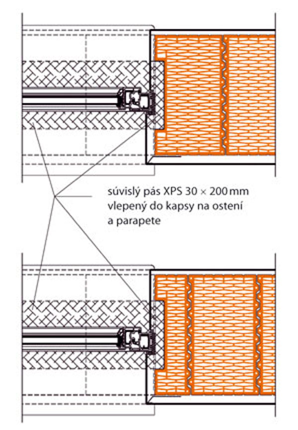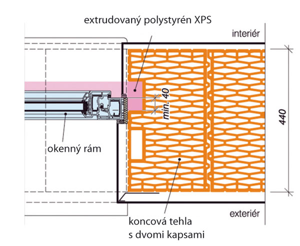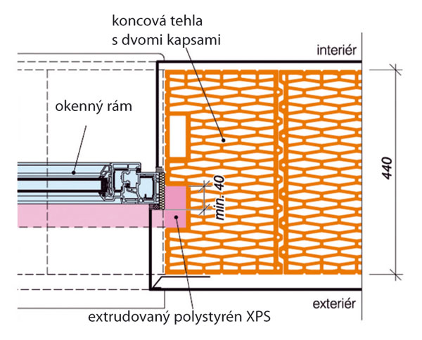 Pri koncových tehlách s jednou kapsou je situácia jednoznačná – po vytvorení ostenia a parapetu treba celú kapsu pred osadením okna vyplniť vhodnou izoláciou (extrudovaným polystyrénom) požadovaných rozmerov.