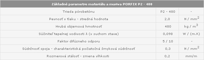 Okrem lepších tepelnoizolačných vlastností (súčiniteľ tepelnej vodivosti v suchom stave je 0,098 W/(m . K)), ako mal pôvodný PORFIX P3-520, je ďalšou veľkou výhodou nového materiálu nižšia hmotnosť tvárnic. Pri výstavbe bežného rodinného domu murári teraz dvíhajú o 3 tony materiálu menej. Práca s tvárnicami PORFIX P2-480 je tak menej fyzicky náročná a stavba rýchlejšie pribúda.