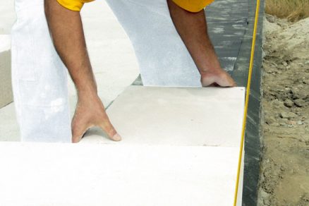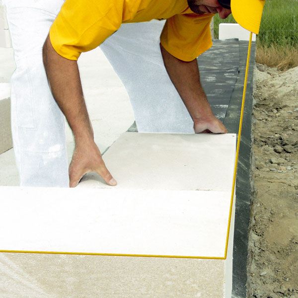 Na základový pás alebo dosku sa po očistení štetkou nanáša penetračný náter. Hydroizolačný pás (podľa projektu) sa odporúča rozprestrieť a nahriať v minimálnej šírke 500 mm. Napojenie hydroizolačných pásov by sa malo riešiť s presahom minimálne 150 mm. Následne sa vymerajú presné rozmery pôdorysu a poloha budúcich obvodových stien. Ako prvá sa ukladá tvárnica vo vnútornom rohu základovej dosky, drážkami k vnútornej strane. Tvárnice sa osadia na vápenno-cementovú maltu hrubú minimálne 20 mm. Odporúča sa ich stabilizovať poklepom gumovým kladivom. Dôležité je dbať aj na vodorovnosť vo všetkých smeroch, najmä v napojení stien. Následne treba vykonať kontrolu výškového osadenia tvárnic vo všetkých rohoch a prípadné nerovnosti zarovnať hoblíkom.
