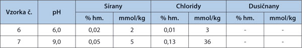 Na podporu uvedenej myšlienky sa uskutočnili ďalšie merania. Keďže sa v okolí analyzovanej spodnej časti stavby nachádzala minerálna voda známeho chemického zloženia, bolo potrebné chemickým rozborom vlhkosti, nachádzajúcej sa v odobratých vzorkách, potvrdiť alebo vylúčiť jej výskyt. Výsledky meraní chemických vlastností vody obsiahnutej vo vzorkách sú uvedené v tab. 2.