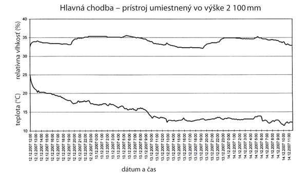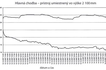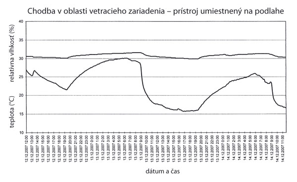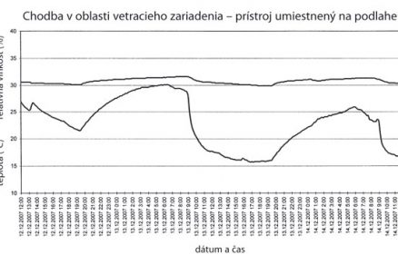 Merania sa uskutočnili vo viacerých miestnostiach, v prvej etape iba vo vybraných miestach. Neskôr, v druhej etape, sa merali uvedené veličiny na viacerých miestach vo zvislých prierezoch. Príklad výsledkov merania uvádza graf. Z analýzy dosiahnutých výsledkov bolo možné vo všeobecnosti konštatovať, že analyzované problémy nevznikli vplyvom kondenzácie vodných pár na vnútornom povrchu konštrukcie. Ako parciálny problém bolo zistené, že klimatizácia v daných priestoroch pracuje nekontrolovane, pričom v uvedených priestoroch vznikajú veľké teplotné rozdiely.