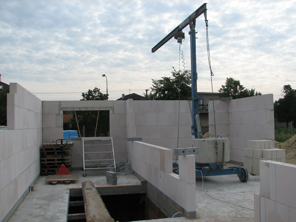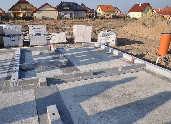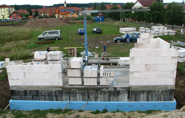 Prvý rad muriva zo špeciálnych tvárnic KS-ISO Kimmsteine na prerušenie tepelného mosta medzi stenami domu a zemou alebo suterénom