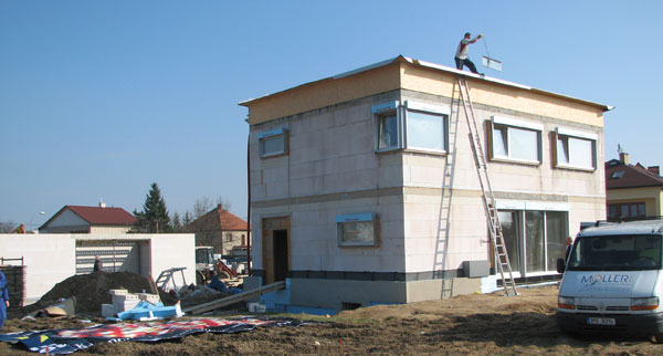 Dvojpodlažné domy s obytnou plochou 149 m2 sa realizujú z vápennopieskových blokov KS-QUADRO E Zapf Daigfuss hrúbky 150 mm, obvodové steny sú zateplené grafitovým polystyrénom hrúbky 260 mm a celková hrúbka obvodovej konštrukcie je 420 mm vrátane omietky.
