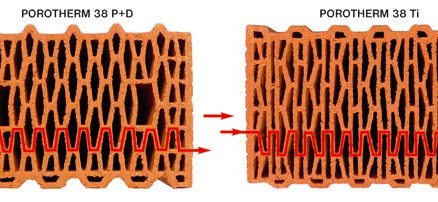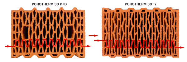 Tehly POROTHERM Ti majú nový tvar dierovania, zvýšený počet radov vzduchových dutín a tenšie vnútorné rebrá v porovnaní s doterajšími tehlami POROTHERM 44 P+D a 38 P+D.