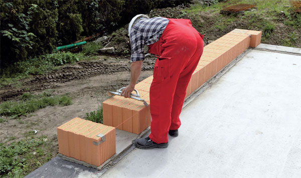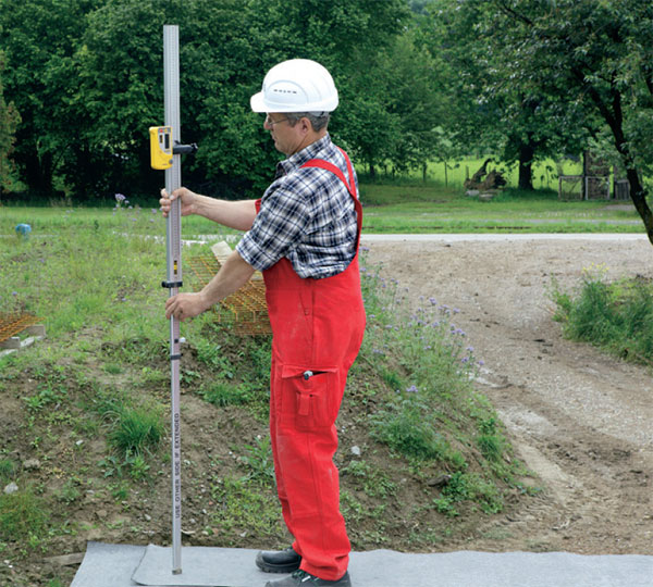 Prvý rad tehál sa ukladá ako zvyčajne do vyrovnávacieho maltového lôžka z vápennocementovej malty, ktorá sa nanáša na vopred natavené izolačné pásy. Pomocou nivelačného prístroja a nivelačnej laty sa určí najvyšší bod na základovej doske (obr. 1). V tomto najvyššom bode sa začne nanášať zakladacie maltové lôžko. Tu bude jeho hrúbka najmenšia (asi 10 mm).