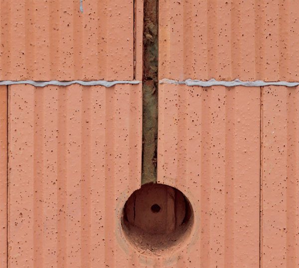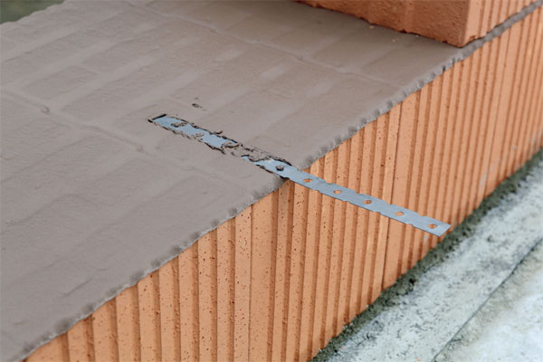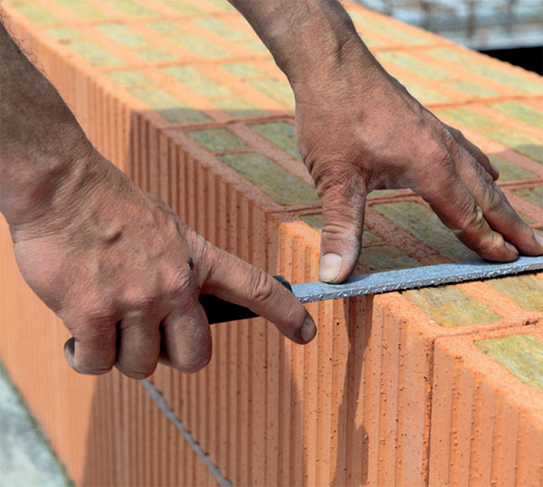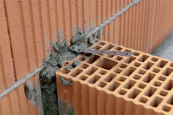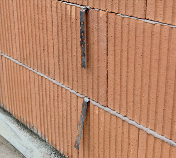 Na napojenie nosných stien a nenosných priečok na obvodovú stenu sa používajú ploché stenové spony z nehrdzavejúcej ocele. Aby pri zabudovaní stenových spôn nedošlo k nežiaducemu zväčšeniu hrúbky ložnej škáry, odporúča sa v mieste osadenia spony rebrá tehál zľahka prebrúsiť keramickým pilníkom (obr. 10), prípadne zaklepať sponu v určenom mieste murárskym kladivom do rebier tehly tak, aby netrčala nad ložnú plochu tehál.