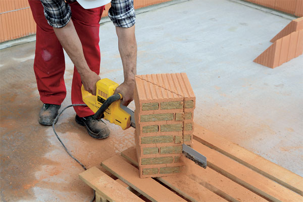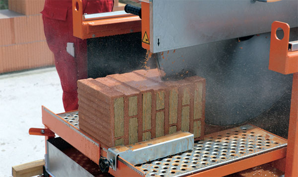 Tehly plnené minerálnou vlnou možno rezať suchým (obr. 15) aj mokrým spôsobom (obr. 16). Stolovou okružnou pílou možno rezať vyrovnávacie tehly na ľubovoľnú výšku alebo robiť šikmé rezy. Šikmo zrezané tehly môžeme využiť na vymurovanie rohu 45° alebo 135° alebo ukončenie štítovej steny.