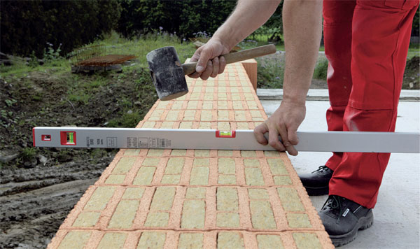 Tehly sa následne v oboch smeroch jemne urovnajú pomocou gumeného kladiva a vodováhy (obr. 4).