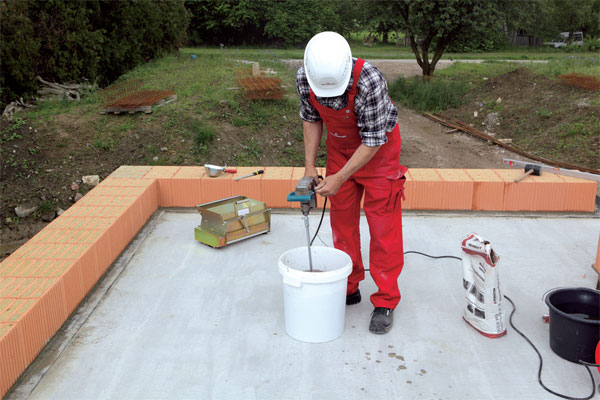 Počnúc druhým radom tehál sa začína murovať na maltu na tenké škáry (lepiaca malta). Lepiaca malta sa zamieša s vodou podľa návodu uvedeného na vreci (obr. 5). Malta umožňuje dvojaké použitie, a to buď takzvané ukladanie kontaktným spôsobom na rebrá tehál, alebo celoplošne na ložnú plochu tehál. Každý z uvedených spôsobov vyžaduje iný druh nanášacieho valca a inú konzistenciu malty.