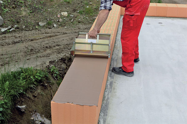 Pred prvým naplnením nanášacieho valca maltou treba zásobník nastriekať tenkou vrstvou silikónového oleja, čím sa uľahčí jeho neskoršie čistenie. Následne sa nanášací valec naplní maltou na tenké škáry. Nanášací valec treba ťahať po tehlách plynule a bez pritláčania. Pri správnej konzistencii malty a správnom nastavení nanášacieho valca (šírka štrbiny by mala byť asi 7 mm, valec musí byť čistý) sa docieli optimálne nanášanie malty na rebrá tehál (respektíve na celú ložnú plochu tehál) (obr. 6).