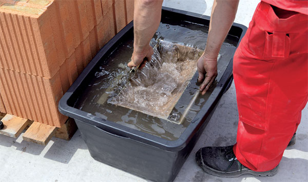 Počas dlhších prestávok v práci treba prázdny nanášací valec vložiť do vody (obr. 8). Tým sa zabráni zaschnutiu malty. Pred pokračovaním v práci sa voda z nanášacieho valca jednoducho vytrasie.