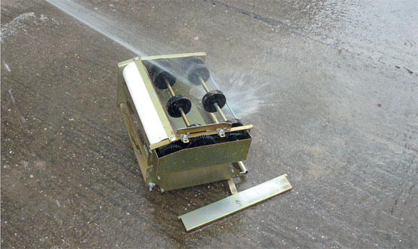 | Obr. 8 Uloženie nanášacieho valca do vody počas prestávky | Obr. 9 Umytie nanášacieho valca prúdom vody |