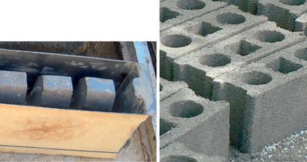 Obr. 3 Oceľová forma a hotové betónové murovacie bloky