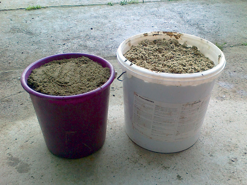 Pred samotnou voľbou technológie úpravy odpadu sa sledoval vplyv vlhkosti naň. U výrobcu, pri preprave a pri skladovaní totiž hrozí riziko vystavenia prvkov poveternostným vplyvom – dažďu. Aj keď charakter minerálnej vlny vykazuje minimálnu nasiakavosť (voda sa udrží iba v chumáčikoch vaty), dochádzalo v miestach prenikania vody k vyplavovaniu piesku. Mikročiastočky skleného prachu, ktorých sa v odpade nachádza značné množstvo, sa zmiešali s chumáčikmi vaty, čím ju znehodnotili (obr. 2 a 3).