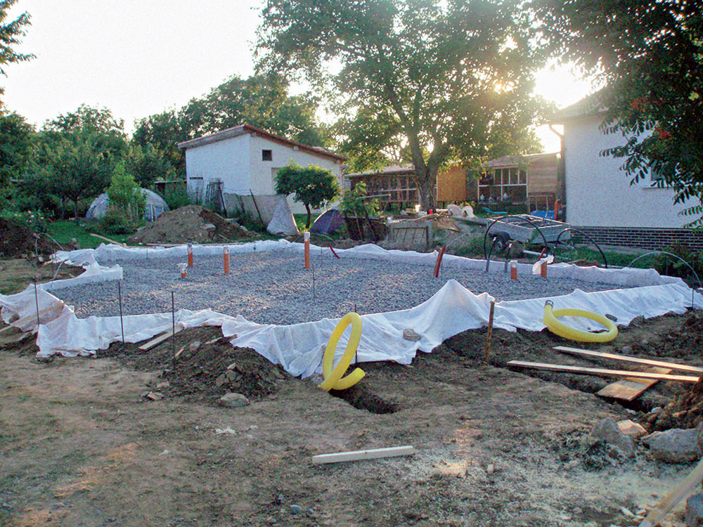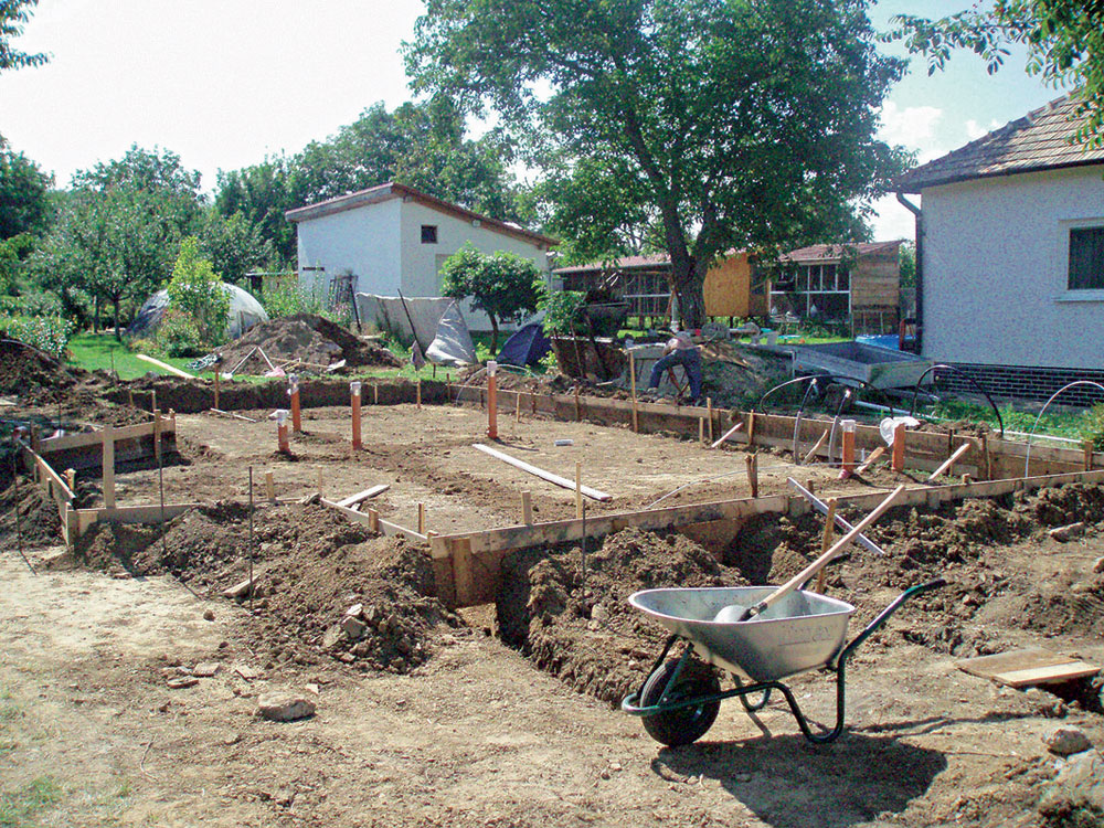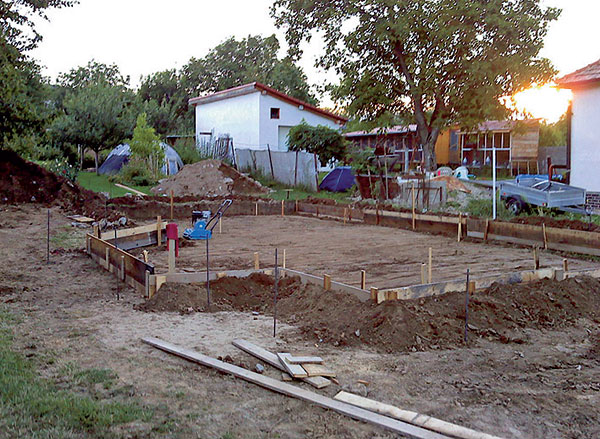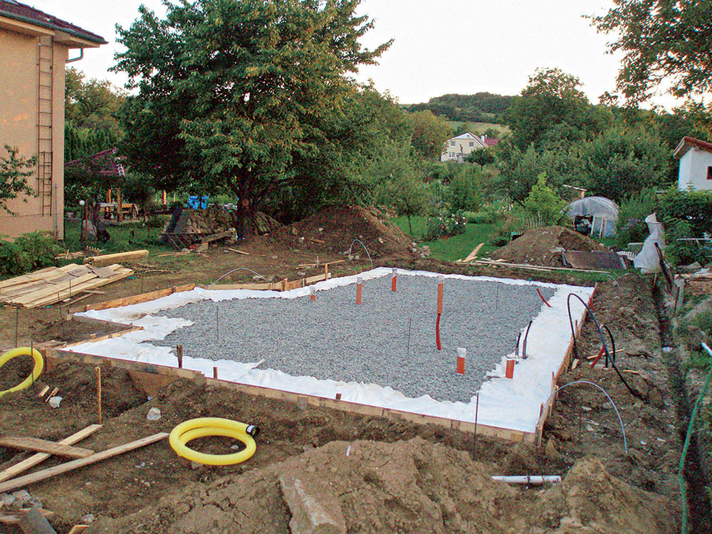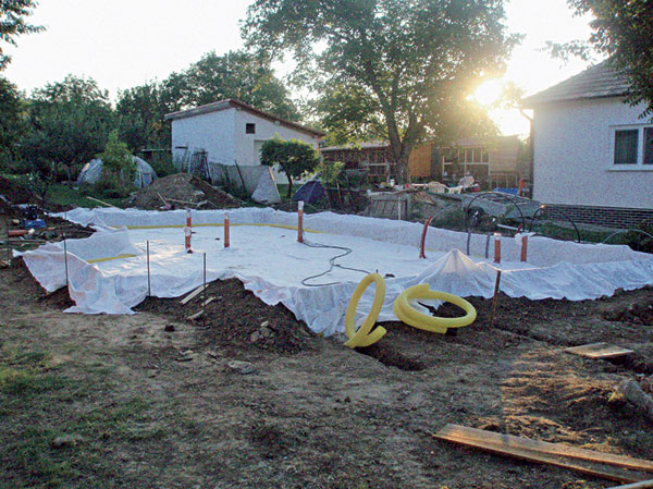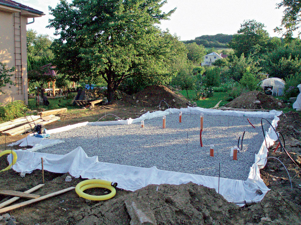 - vyhotovenie výkopu – na základe zistených vlastností podložia a kvality terénu treba vyhotoviť čo najrovnejší podklad (obr. 4). V prípade vzlínajúcej vody alebo vysokej hladiny podzemnej vody je nutné realizovať vyspádované drenážovanie na odvádzanie odpadovej vody z výkopu mimo stavebnú plochu. Následne sa osadia ležaté zvody a prestupy cez budúcu základovú dosku (obr. 5) (kanalizácia, voda…);