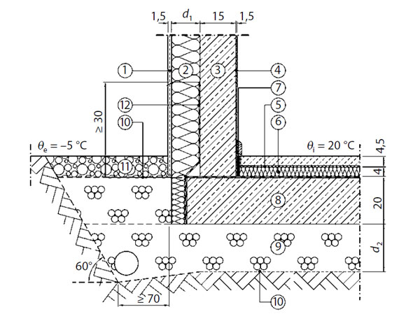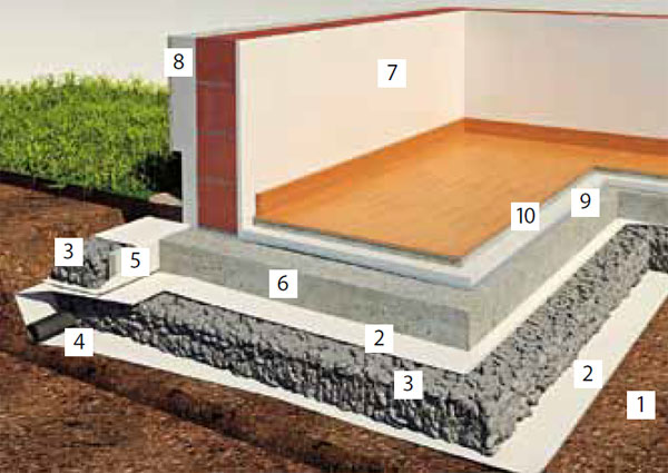 1 – vonkajšia omietka, 2 – tepelná izolácia obvodového plášťa, 3 – obvodový plášť, 4 – vnútorná omietka, 5 – betónový poter, 6 – podlahová izolácia, 7 – dilatačná izolácia, 8 – základová doska, 9 – sklopenový granulát Perimeter 50, 10 – geotextília,