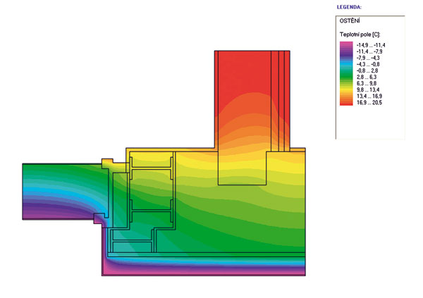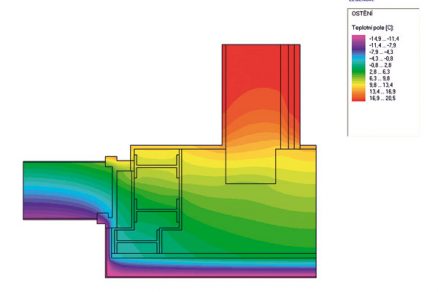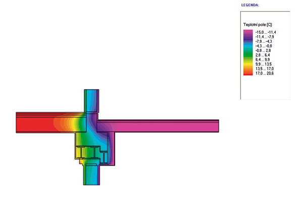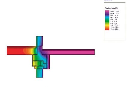 | Teplotné pole modelovaných detailov nadpražia a napojenie lodžiovej dosky (hrúbka tepelnej izolácie 80 mm) v tehlovom dome | |