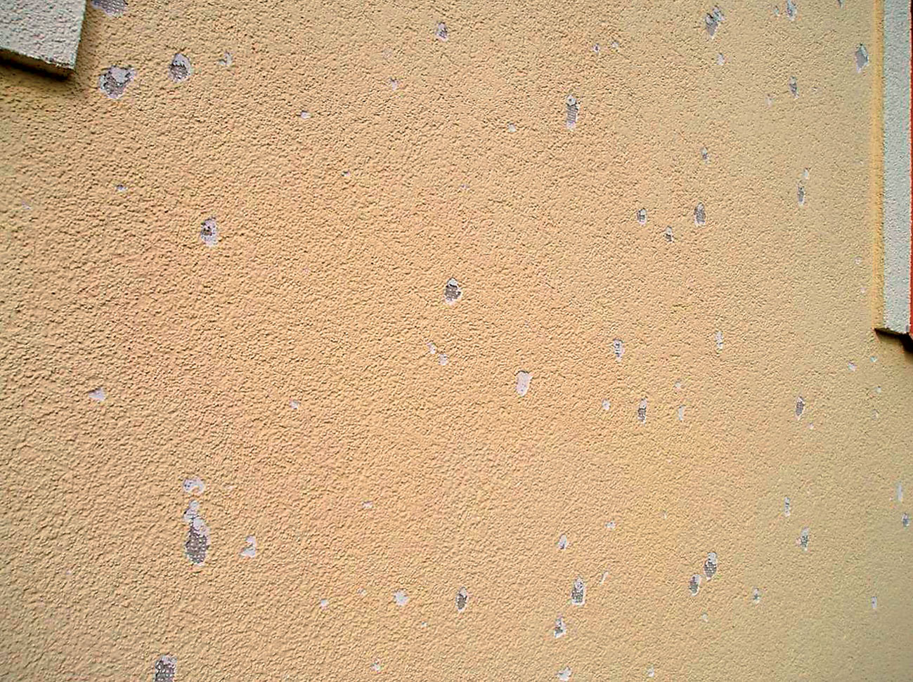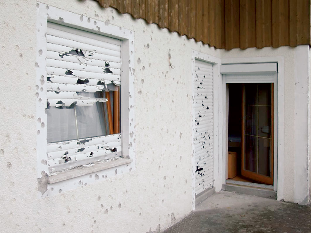 Obr. 1  Poškodenie fasády zateplenej ETICS po krupobití, rodinný dom v Průhoniciach, Česká republika