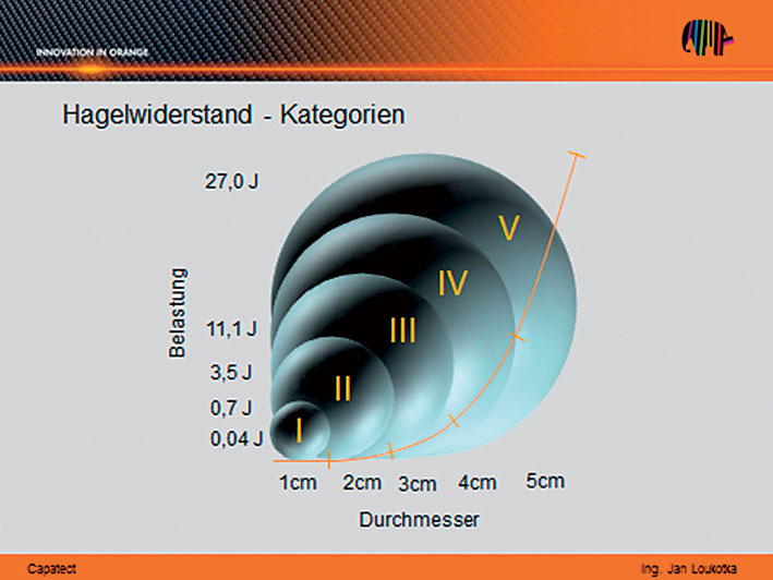 V ostatnom období sa stáva významným problémom častejší výskyt intenzívnych búrok spojených s krupobitím. K poškodeniu fasád zateplených ETICS dochádza pomerne dlhý čas, ale nikto sa zatiaľ nepokúsil o vyjadrenie namáhania, ktorému je fasáda vlastne vystavená. Ak by sme opomenuli vandalizmus, možno sa stretnúť s poškodením znázorneným na obr. 1 a 2. Ide o poškodenie krúpami. Fotografie dokumentujú fasádu rodinného domu v Průhoniciach po búrke v roku 2010, ktorá trvala približne 10 minút. V spolupráci so švajčiarskou skúšobňou EMPA sme sa pokúsili vymodelovať zaťaženie, ktoré môže krupobitie spôsobiť. Na tento účel sme rozdelili veľkosť krúp do viacerých kategórií (obr. 3). Na obrázku vidieť, s akou energiou dopadajú krúpy na povrch steny. Nie je potrebné zložito počítať, že podobnú energiu nárazu ťažko znesie väčšina bežných systémov so základnou vrstvou na cementovej báze, ktoré sa v súčasnosti najbežnejšie používajú.