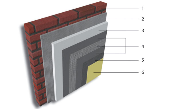 1 – podklad, 2 – lepiaca vrstva Mapetherm AR2, 3 – tepelnoizolačný panel z polystyrénu alebo minerálnej vlny, 4 – výstužná vrstva Mapetherm AR2 so zapracovanou sklotextilnou mriežkou odolnou proti alkáliám, 5 – základný penetračný náter: Silexcolor Base Coat, Silancolor Base Coat, Quarzolite Base Coat, 6 – finálna povrchová úprava: Silexcolor Tonachino, Silexcolor Graffiato, Quarzolite Tonachino, Quarzolite Graffiato, Silancolor Tonachino, Silancolor Graffiato