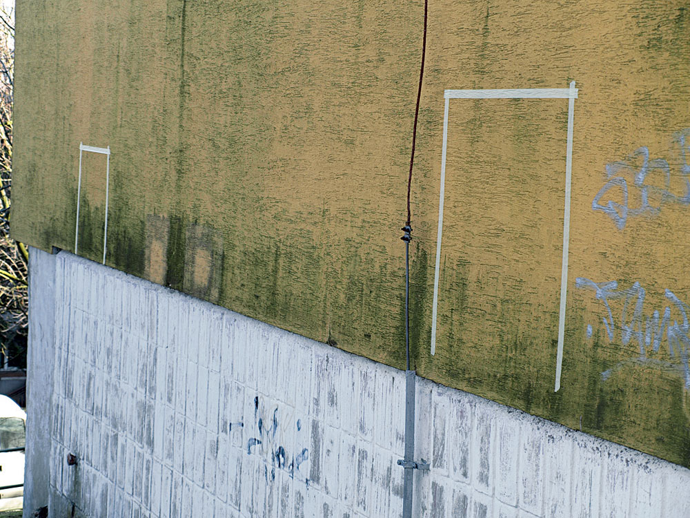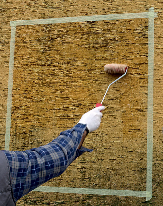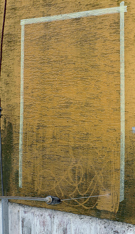 • po 24 hodinách očistenie tlakovou vodou vysokotlakovým čistiacim strojom bez ohrevu vody, bez pridania abrazívnych prípravkov (hrozí mechanické poškodenie podkladu – omietky). Lokálne možno čistiaci efekt zlepšiť mechanicky, kefovaním.
