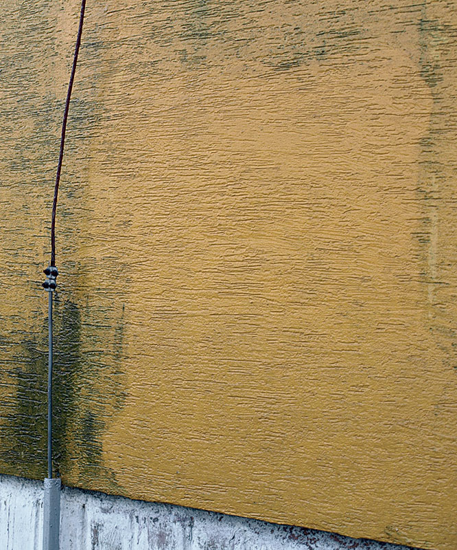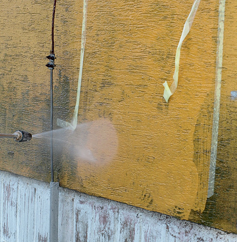 • očistenie povrchu vzdušným prúdom alebo tlakovou vodou vysokotlakovým čistiacim strojom bez ohrevu vody, bez pridania abrazívnych prípravkov (hrozí mechanické poškodenie podkladu – omietky). Lokálne možno čistiaci efekt zlepšiť mechanicky, kefovaním;