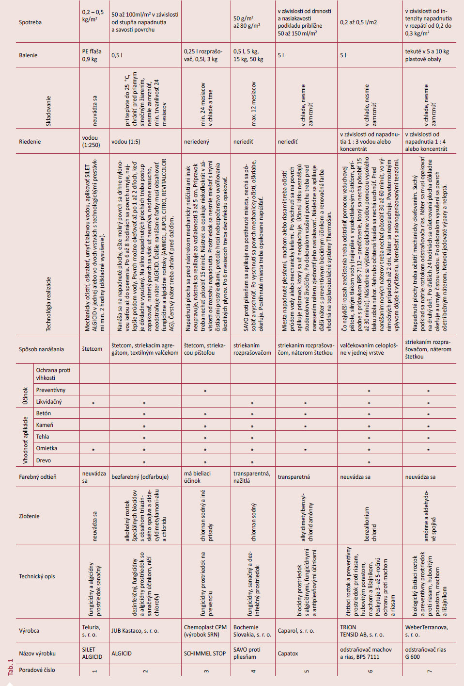 Na elimináciu alebo inhibíciu fotosyntetických organizmov, medzi ktoré patria riasy, machy a lišajníky, sa v stavebníctve s dobrým likvidačným účinkom používajú overené chemické prípravky na báze ťažkých kovov, ale aj rôznych biologických zlúčenín (tab. 1). Treba mať však na pamäti, že často ide o toxické látky, ktoré vyžadujú správnu manipuláciu a aplikáciu aj vysokú ochranu pri kontakte so životným prostredím. V každom prípade treba zabrániť priamemu styku vody a pôdy s použitým chemickým prípravkom. Preto aj v tejto súvislosti treba rozlišovať, či ide o technológiu, ktorá sa používa v kombinácii s následným oplachovaním čistených plôch tlakovou vodou, alebo o technológiu, pri ktorej treba kontaminovaný povrch očistiť nasucho alebo tlakovou vodou pred aplikáciou biocídov. Výber technológie závisí od veľkosti zasiahnutej plochy, kvantifikácie mikroorganizmov na fasáde a následného určenia účinného chemického prípravku. Každý výrobca je povinný poskytnúť technický list prípravku a kartu bezpečnostných údajov prípravku, z ktorej sú zrejmé toxikologické informácie, údaje o nebezpečenstvách, opatreniach pri manipulácii, skladovaní, doprave, používaní, zneškodňovaní a ekologické informácie.