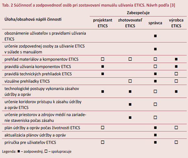 Od každého, kto tvorí a aktualizuje manuál, sa vyžaduje patričná zodpovednosť (tab. 2). Manuál užívania ETICS treba chápať ako súčasť dokumentácie celého systému riadenia kvality.