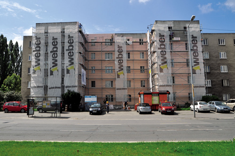 Na zateplenie obvodového plášťa bytového domu sa použil kontaktný tepelnoizolačný systém s tepelnou izoláciou na báze fenolovej peny (weber.therm plus ultra) (obr. 5), penového polystyrénu EPS 200 Perimeter a na báze minerálnej vlny Nobasil FKD v závislosti od miesta aplikácie.