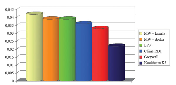 Porovnanie vlastností dosiek z fenolovej peny a ostatných izolantov znázorňuje graf na obr. 8, kde MW označuje minerálnu vlnu, EPS označuje expandovaný polystyrén, Clima je perforovaný polystyrén, Greywall je sivý polystyrén a Kooltherm sú dosky z fenolovej peny.
