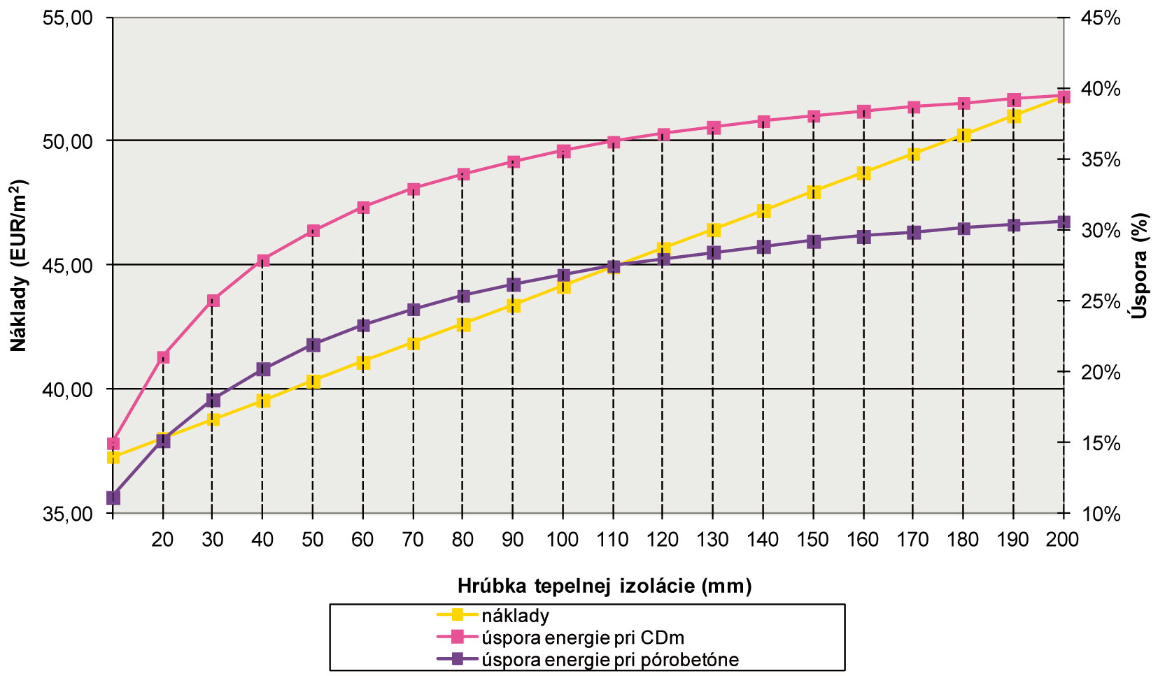 Modelový príklad znázorňuje závislosť nárastu nákladov na zateplenie obvodovej steny z pórobetónu alebo pálenej tehly od použitej hrúbky tepelnej izolácie, na ktorú sa vzťahuje zodpovedajúca výška úspor tepla. Náklady na zateplenie narastajú s hrúbkou tepelnej izolácie, nárast úspor tepla je však od určitej hrúbky miernejší a návratnosť vložených prostriedkov sa postupne predlžuje.