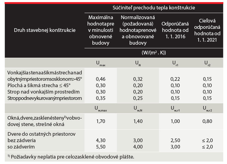 Tab. 1 Výber požiadaviek na hodnoty súčiniteľa prechodu tepla (zdroj: STN 73 0540-2: 2012, SÚTN)