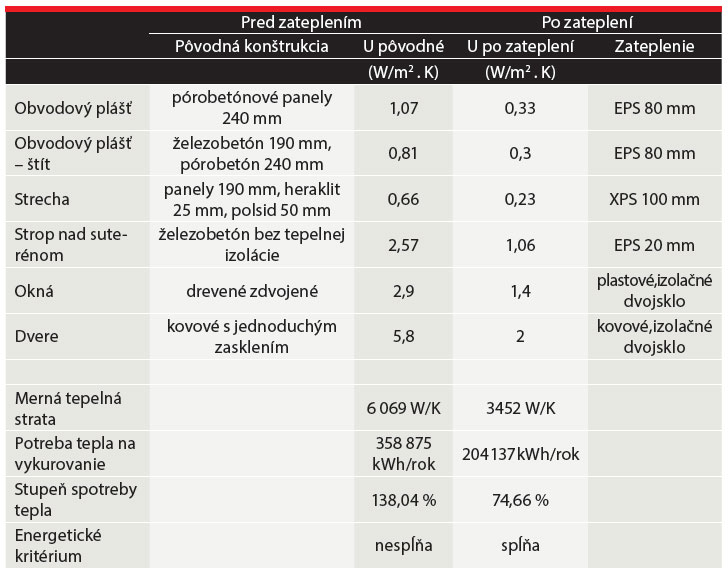 Tab. 3 Zmena tepelnotechnických parametrov po zateplení