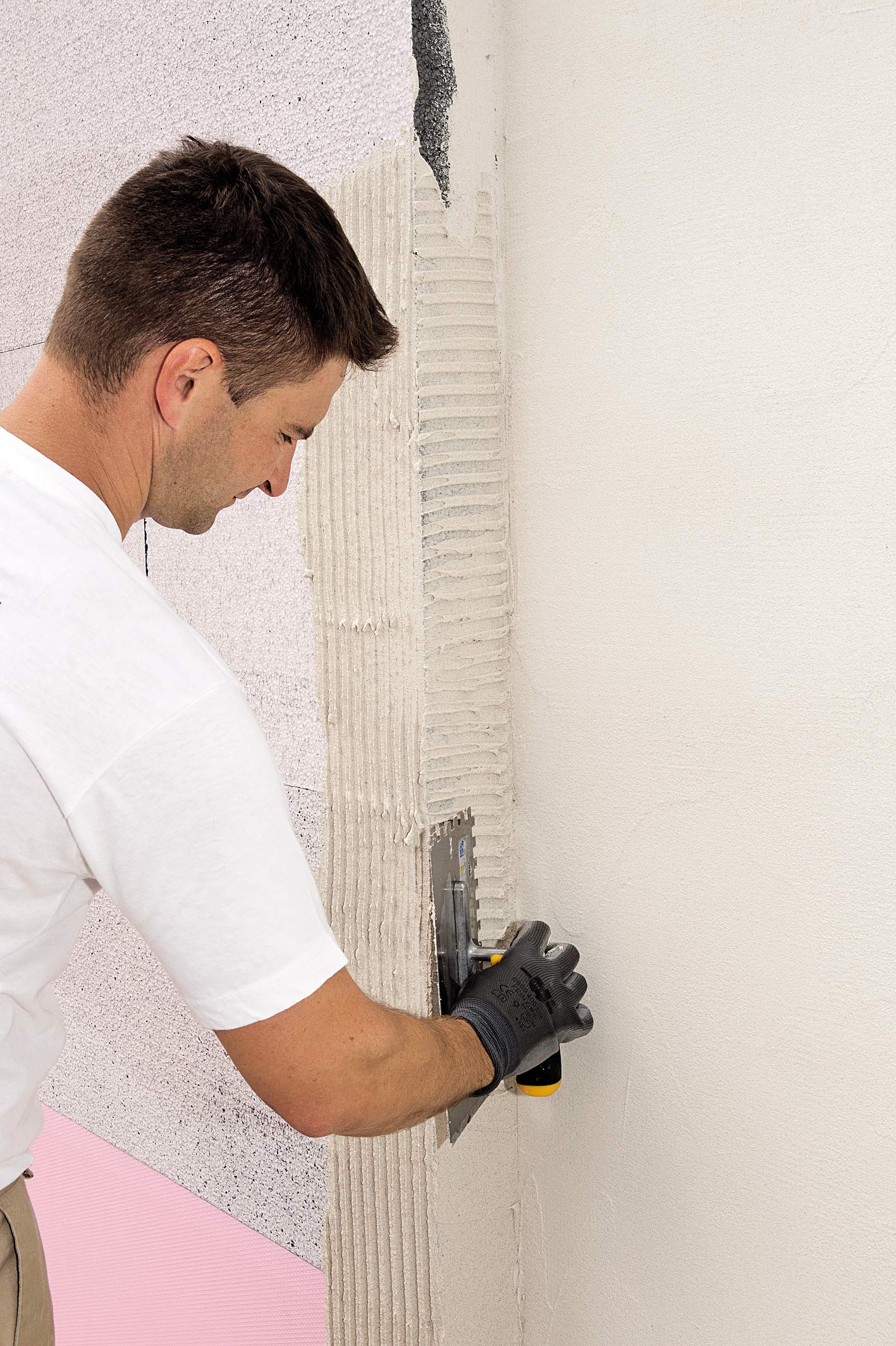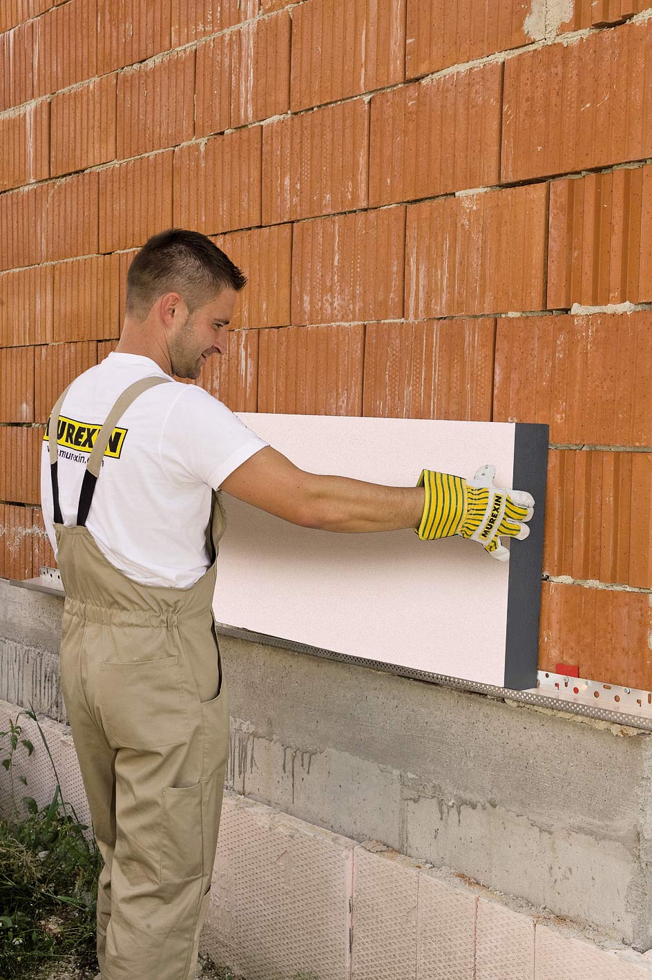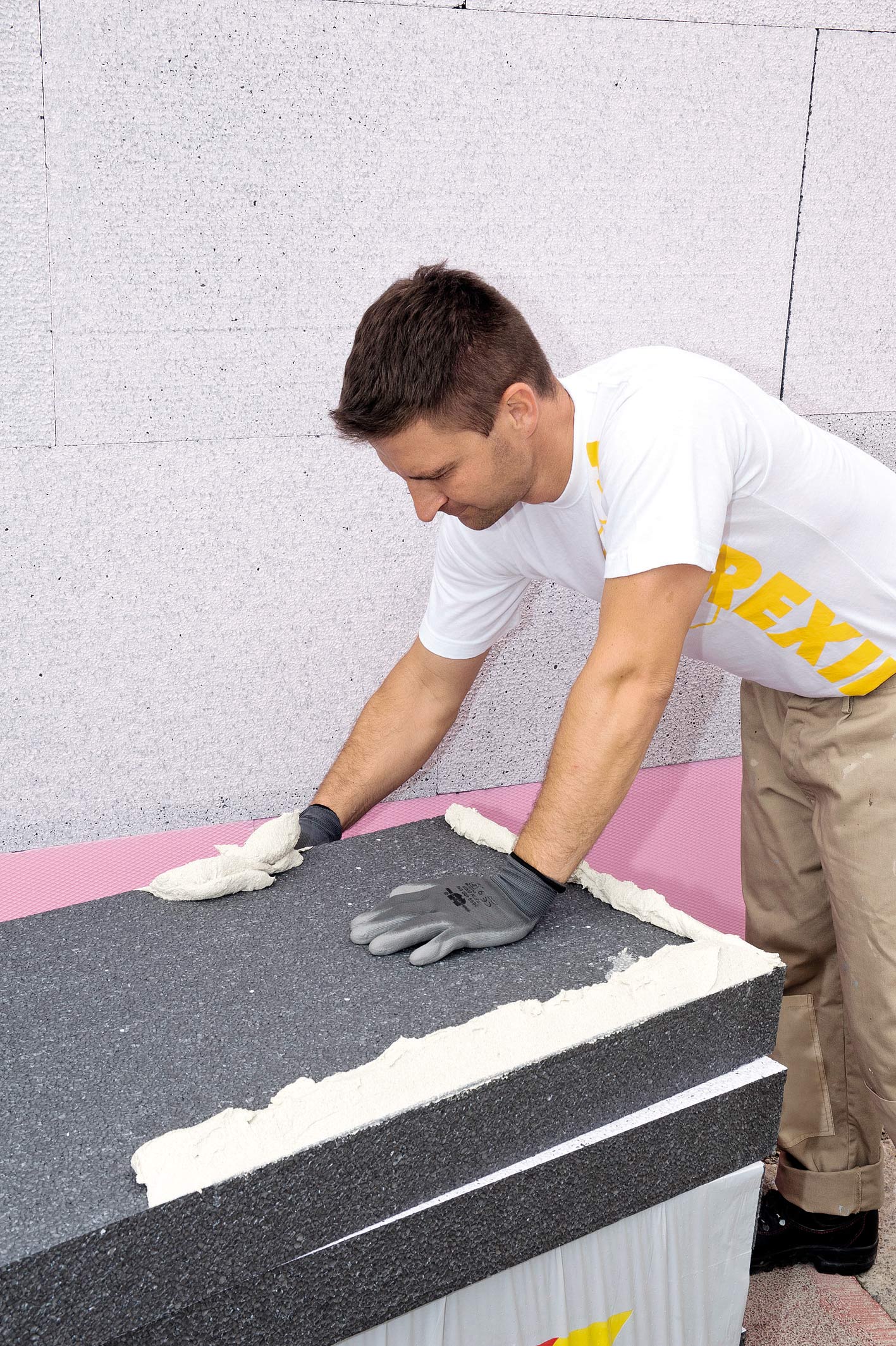 Polystyrénová doska sa osadí na soklový profil a pritlačí. Tým sa vytvorí lepený spoj na približne 40 až 60 % plochy. Po uložení prvého radu sa dosky v ďalších radoch lepia na väzbu, posunuté o 1/2 dĺžky. Treba dbať na to, aby medzi jednotlivými doskami nevznikali škáry a aby sa do spojov nedostala lepiaca malta.