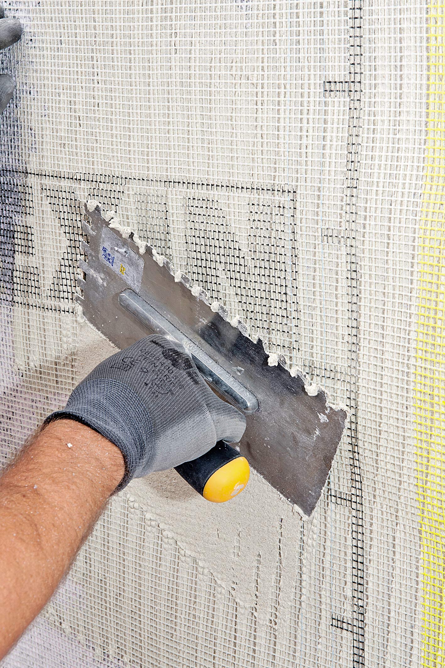 Antikorovým zubovým hladidlom so zubmi 10 × 10 mm sa na dosky nanesie stierka, do ktorej sa vloží sklotextilná sieťka nastrihaná na pásy s potrebnou dĺžkou. Jednotlivé pásy sieťky sa spájajú s presahom 10 cm. Sieťka sa do stierky vtláča pomocou hladidla. Po zahladení stierky má byť hrúbka výstužnej vrstvy 3 až 4 mm.