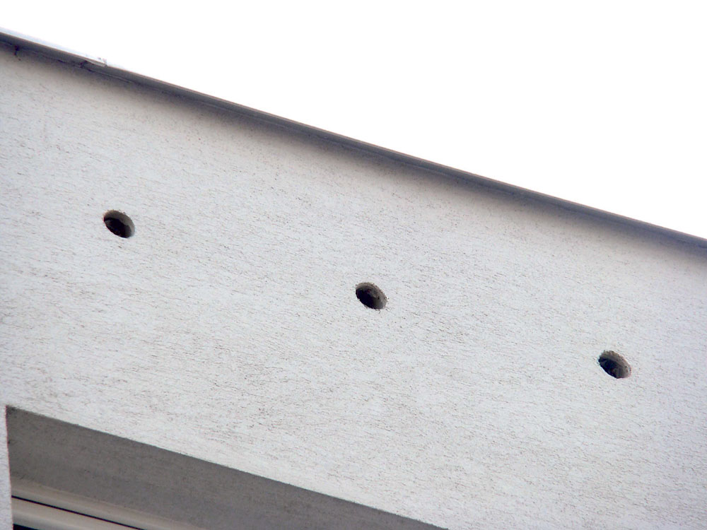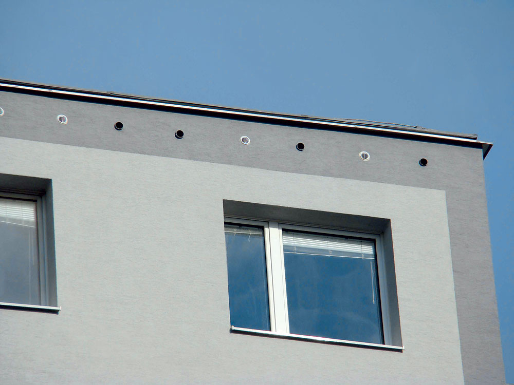 - ak sa v projekte zateplenia budovy počíta so zachovaním vetracích otvorov, treba ich upraviť a ošetriť tak, aby mali vtáky a netopiere aj naďalej voľný prístup k dutinám. Zachovanie prístupu k vetracím otvorom v atike domu sa dosiahne úpravou vetracej mriežky (odstránenie lamiel v spodnej časti približne vo dvoch tretinách mriežky v prípade 75 mm mriežky alebo z celej mriežky, ak ide o 50 mm otvor) a zdrsnením vnútorného povrchu novodurovej trubky vedúcej do vetracieho otvoru tak, aby sa zachoval voľný prístup k otvoru pre dážďovníky a netopiere. V prípade, že mriežku netreba osadiť, možno do otvoru vložiť len novodurovú trubku. Prax ukázala, že pri vyrezávaní otvorov v polystyréne sa stáva, že v dôsledku nepravidelnosti otvorov na stene atiky otvory v tepelnej izolácii nekorešpondujú alebo len čiastočne korešpondujú s otvormi v atike. Ide o veľmi nebezpečný faktor, keďže v dôsledku nedostatočného priestoru sa môže stať, že sa dážďovník zasekne v malom otvore a nedostane sa z otvoru von. Preto treba pri vytváraní otvorov v izolačnej vrstve dbať na to, aby otvory boli na takom istom mieste, ako sú na atike. Ponechanie vetracích otvorov je najlacnejším a najmenej náročným riešením, ktoré zabezpečí dlhodobé zachovanie hniezdisk a úkrytov (obr. 5 až 7).
