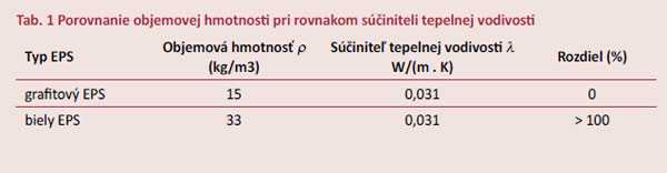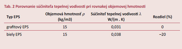 Porovnanie hodnôt súčiniteľa tepelnej vodivosti EPS a grafitového EPS v závislosti od objemovej hmotnosti vidieť na obrázku 2 a v tabuľkách 1 a 2.