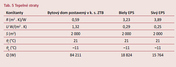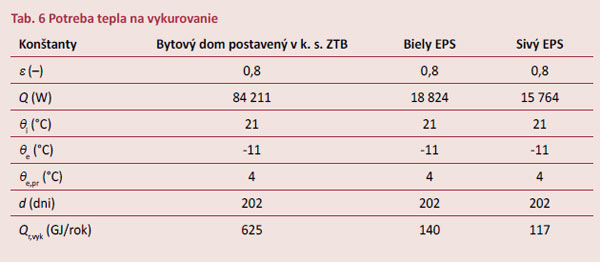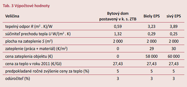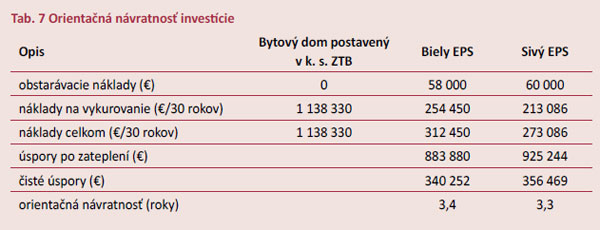 Aby bolo možné úspory energie na vykurovanie a návratnosť investície relevantne hodnotiť, vypočítali sa tepelné straty nezatepleného objektu, zateplenej budovy s tepelnou izoláciou na báze bieleho polystyrénu a zateplenej budovy s tepelnou izoláciou na báze sivého polystyrénu. Náklady na vykurovanie sa pripočítali k obstarávacím nákladom v prípade investície do zateplenia. Pri uvažovanej životnosti tepelnoizolačného systému 30 rokov sa získali výsledné hodnoty uvedené v tab. 3. Obstarávacie náklady sa počítali pri zateplení budovy tepelnou izoláciou s hrúbkou 10 cm so silikónovou povrchovou úpravou.