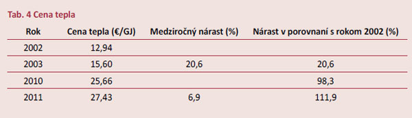 Vo výpočte sa uvažovalo ročné navýšenie ceny tepla o 5 %, a to na základe verejne dostupných informácií o vývoji ceny tepla za posledné roky. V tabuľke 4 je uvedený vývoj ceny tepla pre stredné Slovensko.