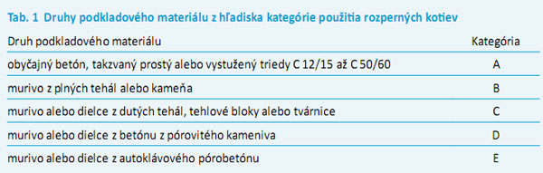Druhy podkladového materiálu z hľadiska kategórie použitia rozperných kotiev sa vo vzťahu k materiálu nosnej vrstvy podkladu rozdeľujú podľa tab. 1.