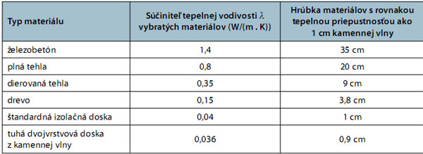 Tab. Porovnanie súčiniteľa tepelnej vodivosti λ stavebných materiálov