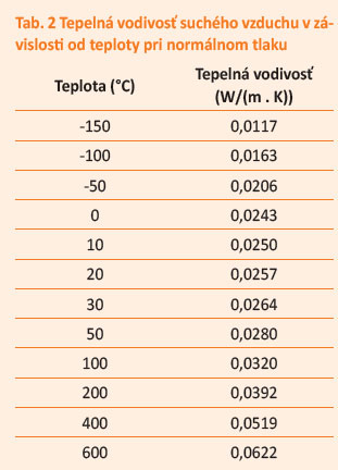 Údaj o tepelnej vodivosti izolačnej látky – či už zisťovaný meraním, alebo preberaný z literatúry alebo iných technických podkladov – treba teda vždy spájať nielen s objemovou hmotnosťou, ale aj s teplotou, ku ktorej sa vzťahuje. Tepelná vodivosť tuhých látok aj plynov vo všeobecnosti narastá s teplotou. Napríklad pri vzduchu je táto závislosť zrejmá z tab. 2. Narastá teda aj tepelná vodivosť izolácie.