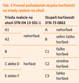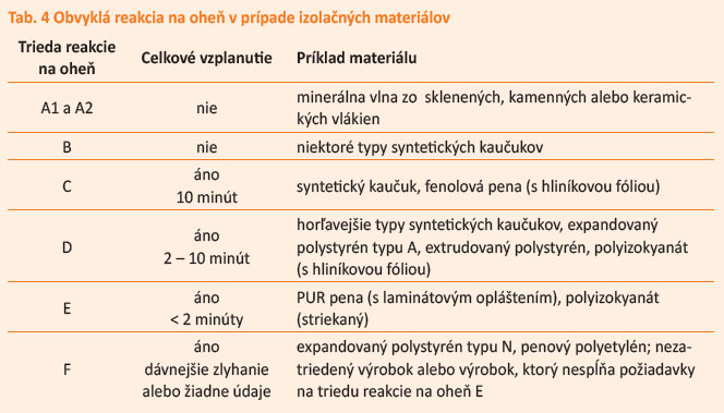 Celkový pohľad na možné zaradenie náhodne zvolených materiálov do jednotlivých tried možno vyčítať z tab. 4. Konkrétnu triedu reakcie na oheň treba pri špecifickom výrobku overiť u výrobcov izolačných materiálov, ktorí sú povinní uvádzať triedu reakcie na oheň na základe skúšok vykonaných v skúšobniach.