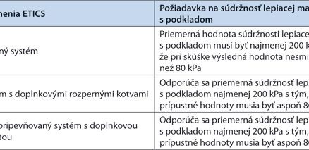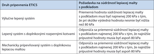 Medzi základné charakteristiky zásadne ovplyvňujúce upevnenie ETICS na podklade patrí súdržnosť lepiacej malty a konkrétneho podkladu. Keďže táto charakteristika vzhľadom na rozmanitosť existujúcich podkladov nie je a nemôže byť súčasťou deklarácie od výrobcu ETICS, jej posúdenie pri stavbe je nevyhnutným krokom pri realizácii systému. Pri jednotlivých druhoch pripevnenia ETICS sa môže v nadväznosti na STN 73 2901 vyžadovať splnenie zodpovedajúcich požiadaviek (tab. 1). Pri ich nesplnení sa upevnenie ETICS na podklade môže porušiť.